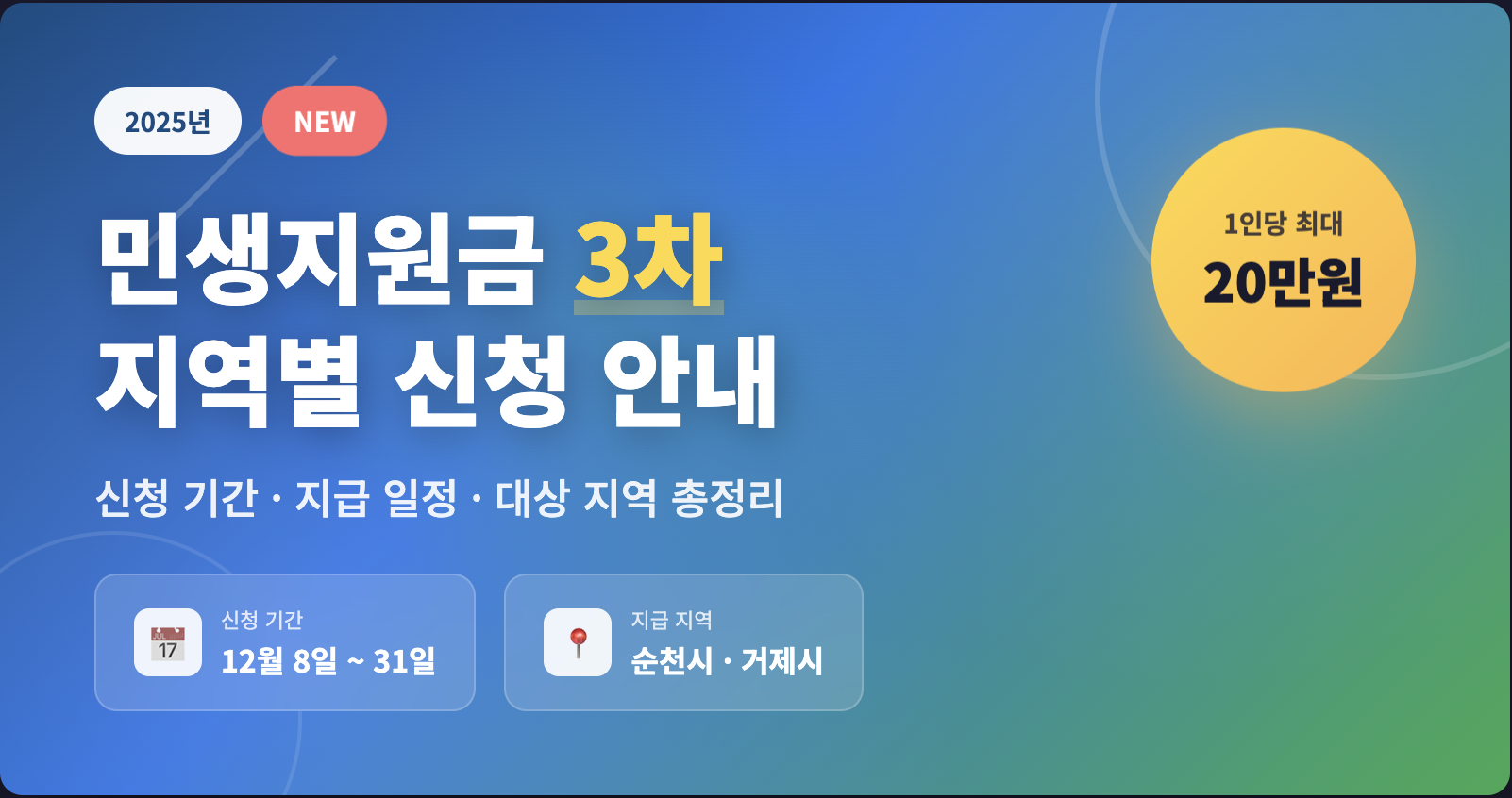 1차와 2차 민생지원금 신청이 마무리된 가운데, 많은 분들이 3차 민생지원금 지급 여부에 대해 궁금해하고 계십니다. 결론부터 말씀드리면, 현재 정부 차원의 전국민 대상 3차 민생지원금은 아직 확정되지 않았지만, 일부 지자체에서는 자체 예산을 편성하여 주민들에게 1인당 최대 20만원의 민생지원금을 지급하고 있습니다. 특히 순천시와 거제시는 이미 신청을 시작했으며, 지금 바로 확인하지 않으면 신청 기간을 놓칠 수 있습니다. 이번 글에서는 민생지원금 3차 지급일, 신청 방법, 지역별 정보, 신청 기간까지 모두 정리해 드리겠습니다.